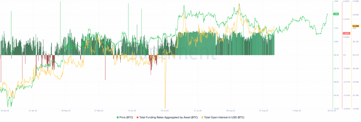 未平仓合约已攀升至405.9亿美元,显示更多交易者正在以低风险方式参与市场。这意味着本轮上涨更多由真实需求与稳健头寸驱动。