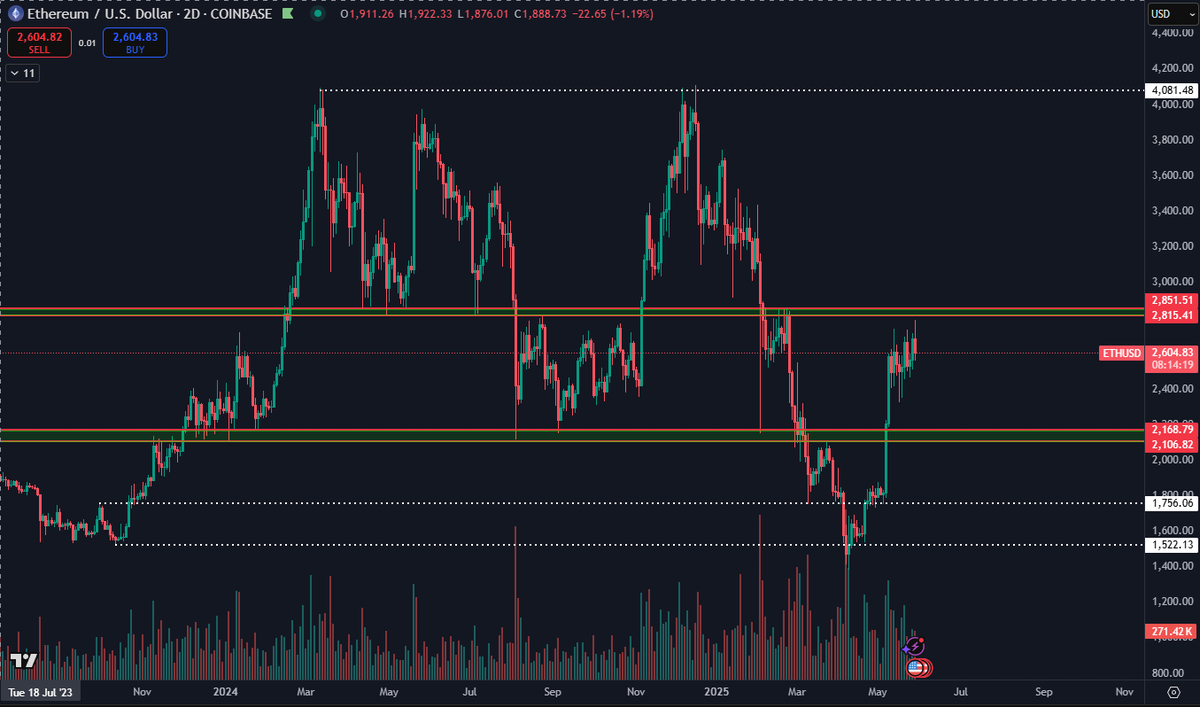 报告附带的图表显示,以太坊从2100美元支撑位反弹后,目前正在测试2800美元区域。
