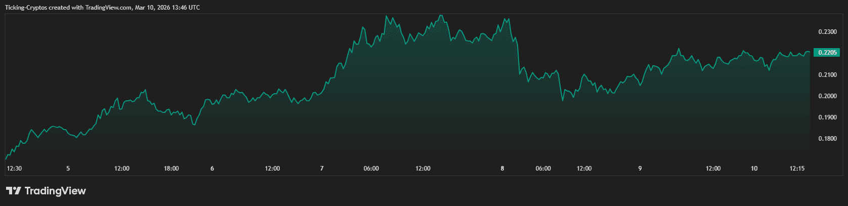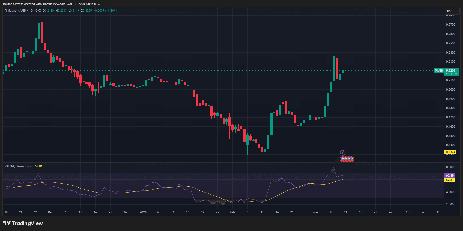 Pi Network (PI) 当前交易价格为 0.221 美元,在过去 24 小时内上涨 2.15%。这一价格走势与数字资产市场的广泛复苏趋势一致,但 3 月 14 日即将到来的 Pi Day 显著放大了这一波动。随着社区期待重要的路线图更新和生态系统里程碑,该代币成功维持在关键心理支撑位上方。
