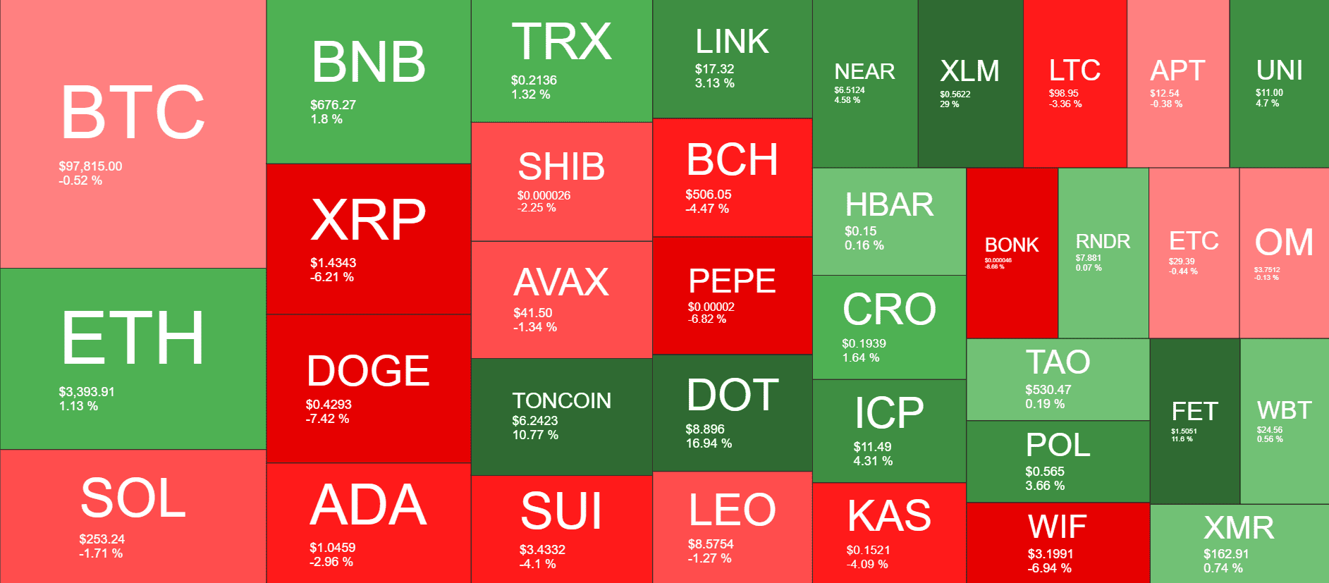 在上周五和周六,比特币未能突破备受期待的10万美元大关,导致其价格小幅回落至目前的约98,000美元。与此同时,一些替代币如XRP和DOGE在过去一天内也出现了大幅下跌,而TON、DOT和XLM等币种则实现了两位数的涨幅。