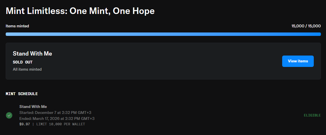 这份求助获得了超乎想象的响应。为支付乌富克治疗费用而创建的"一次铸造,一份希望"NFT系列在OpenSea平台以10.13美元单价发行。总共15,000枚NFT在短时间内被完全铸造并售罄。