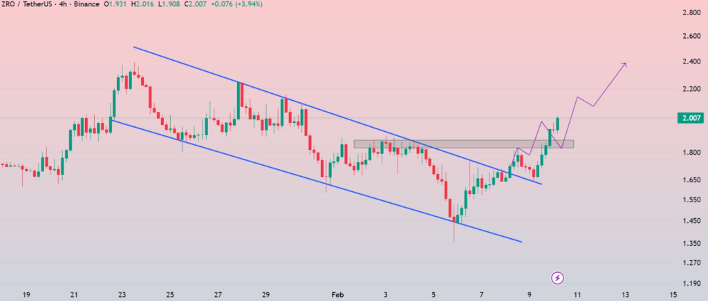 ZRO的短期价格结构支持看涨叙事。该代币已收复2美元关口并突破关键移动平均线,其动量指标显示动能超越整体市场趋势。价格走势呈现强劲反弹,趋势指标与震荡指标共同表明下行压力减弱,延续上涨的可能性正在增加。
