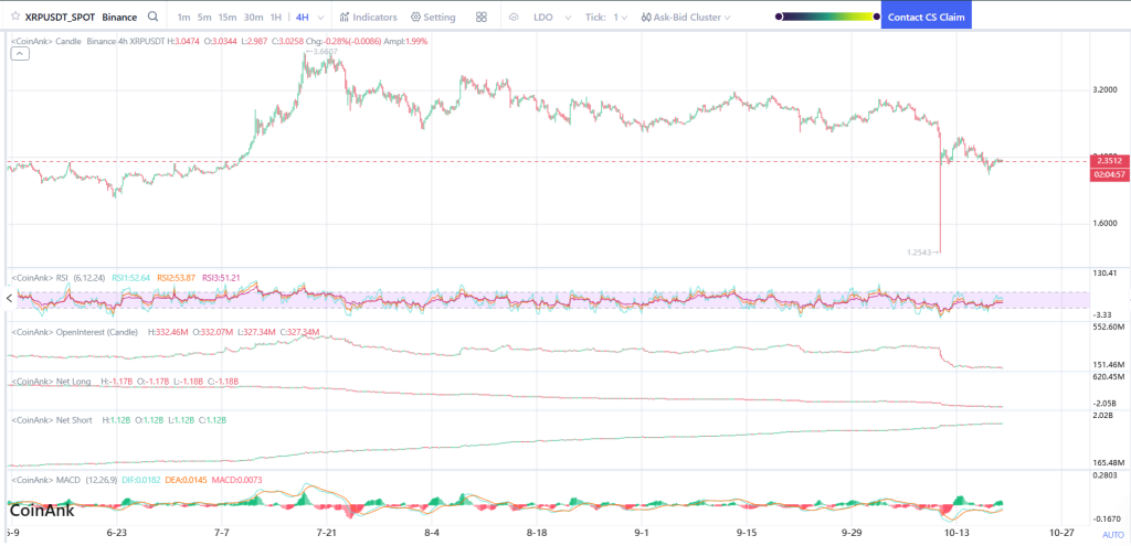 4小时图显示,XRP自9月中旬以来持续处于下降通道。代币在夏季反弹后动能衰竭,最终跌破3美元关口,确认短期看跌形态。1.25美元的深度下探后迅速反弹至2.30美元上方,呈现典型流动性收割特征。
