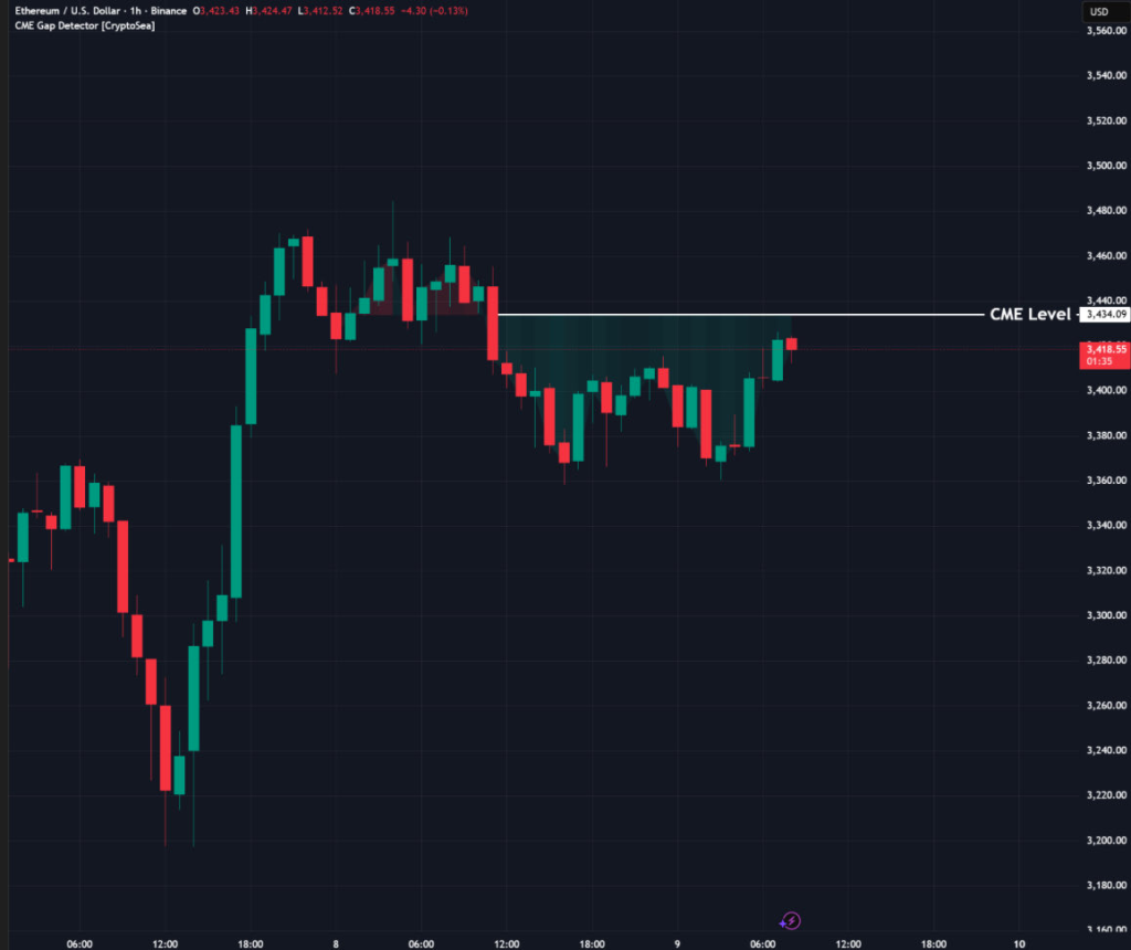 价格正逼近3,434美元的CME缺口,同时3,500美元构成近期需关注的关键阻力。