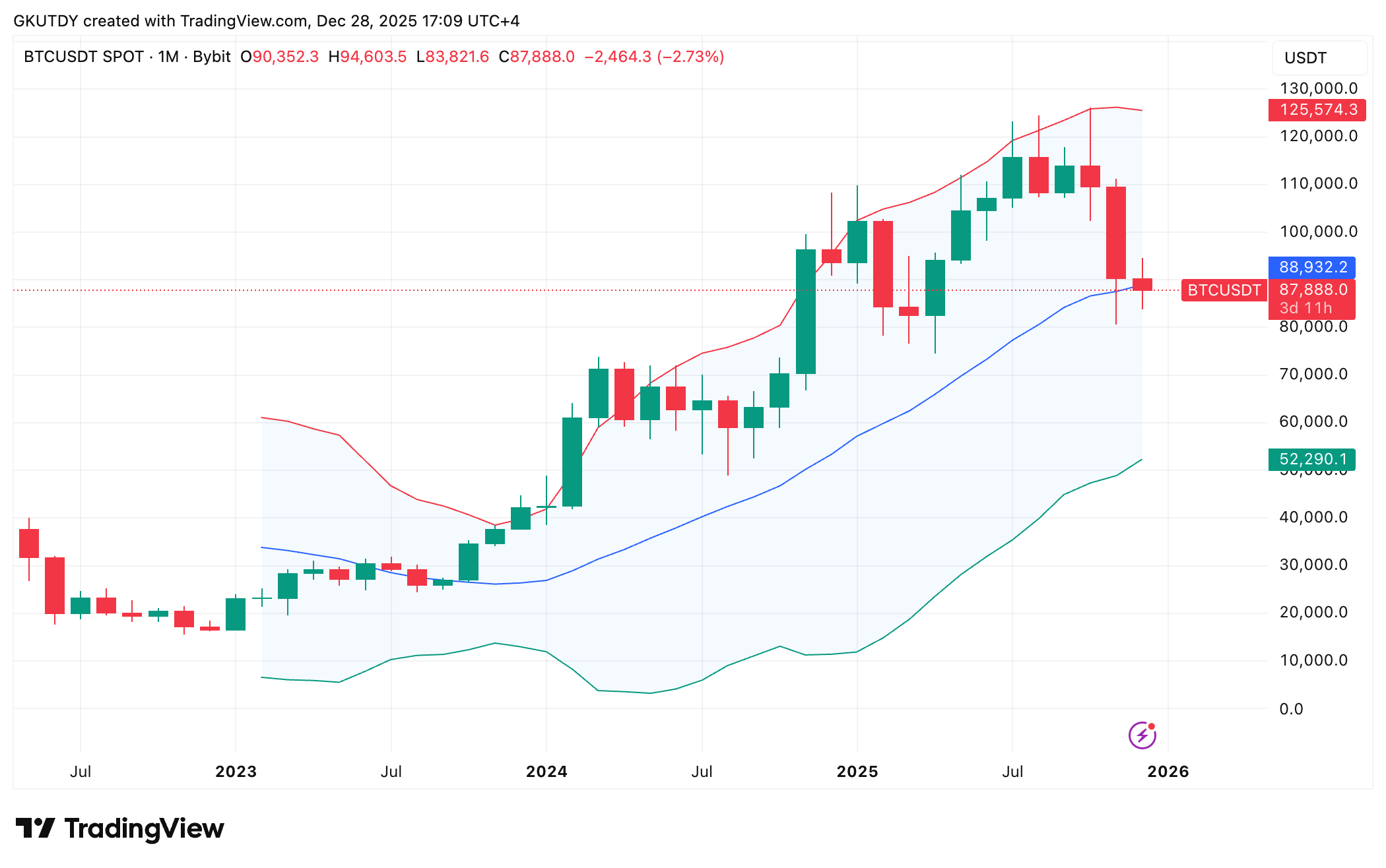每个月末收盘皆蕴含故事,但本次却带着倒计时。比特币十二月K线正悬于88,929美元布林带中轨——这条精确划分狂热与恐慌的技术分水岭。