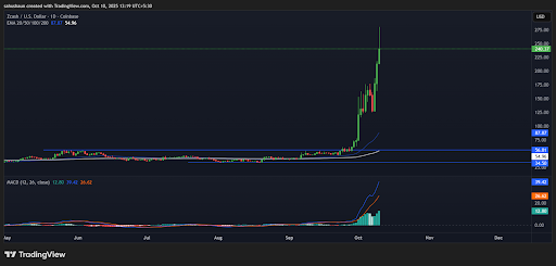 当前ZEC价格约240美元,远高于50日指数移动平均线(87.56美元)和200日指数移动平均线(54.89美元)。这种突破主要均线的走势标志着长期盘整趋势已转变为强劲上升趋势,价格与均线之间的巨大差值更凸显了背后的看涨动能。