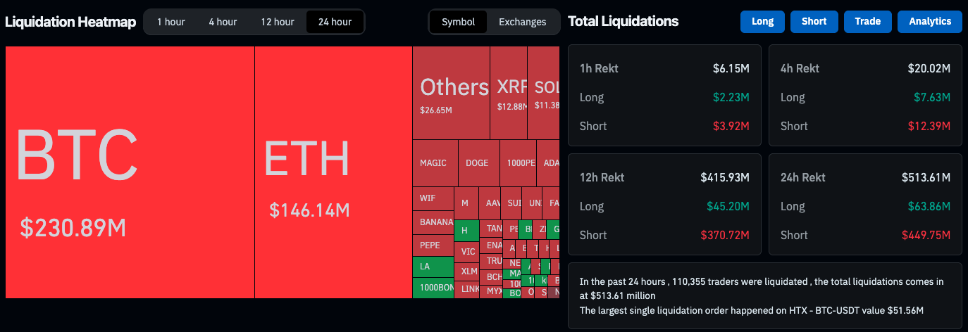 加密货币市场24小时内爆仓金额达5.14亿美元,其中比特币爆仓2.31亿美元,以太坊爆仓1.46亿美元。Coinglass恐惧与贪婪指数已达72,表明市场处于贪婪状态。