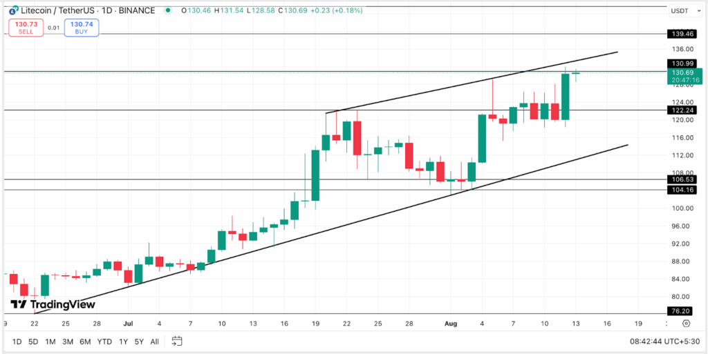该技术形态通常看涨,意味着价格往往会持续上涨直至通道被突破。目前LTC价格接近通道上轨131美元附近,若能延续涨势,下一关键阻力位将位于154美元(较现价仍有18%上行空间)。若价格跌破122美元支撑,则看涨预期减弱,下一重要支撑位见106美元。