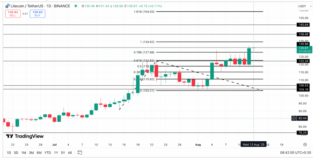 莱特币(LTC)成为今年表现最亮眼的加密货币之一,当前价格较去年同期上涨超过110%。在过去24小时内,随着加密市场整体反弹,LTC价格飙升近11%。最新图表显示其仍具备显著上涨空间,技术指标暗示154美元或将成为下一个关键目标位。