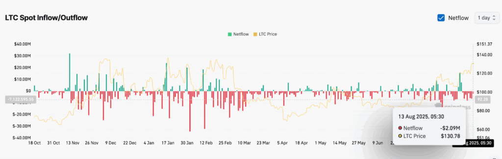 链上数据显示莱特币正持续从交易所流出,仅8月13日单日就有价值200万美元的LTC转出交易平台。