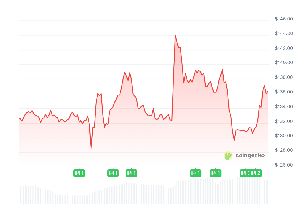 由于市场下行趋势和获利了结可能引发的抛售,Solana在过去一周一直横盘交易。12月11日,Solana币交易价格为136.12美元。