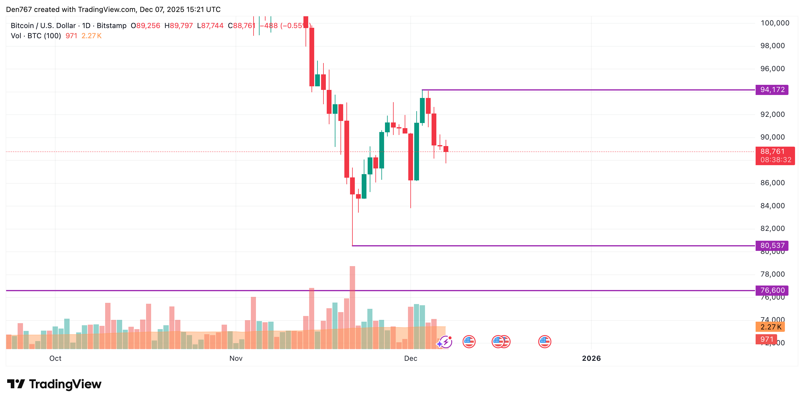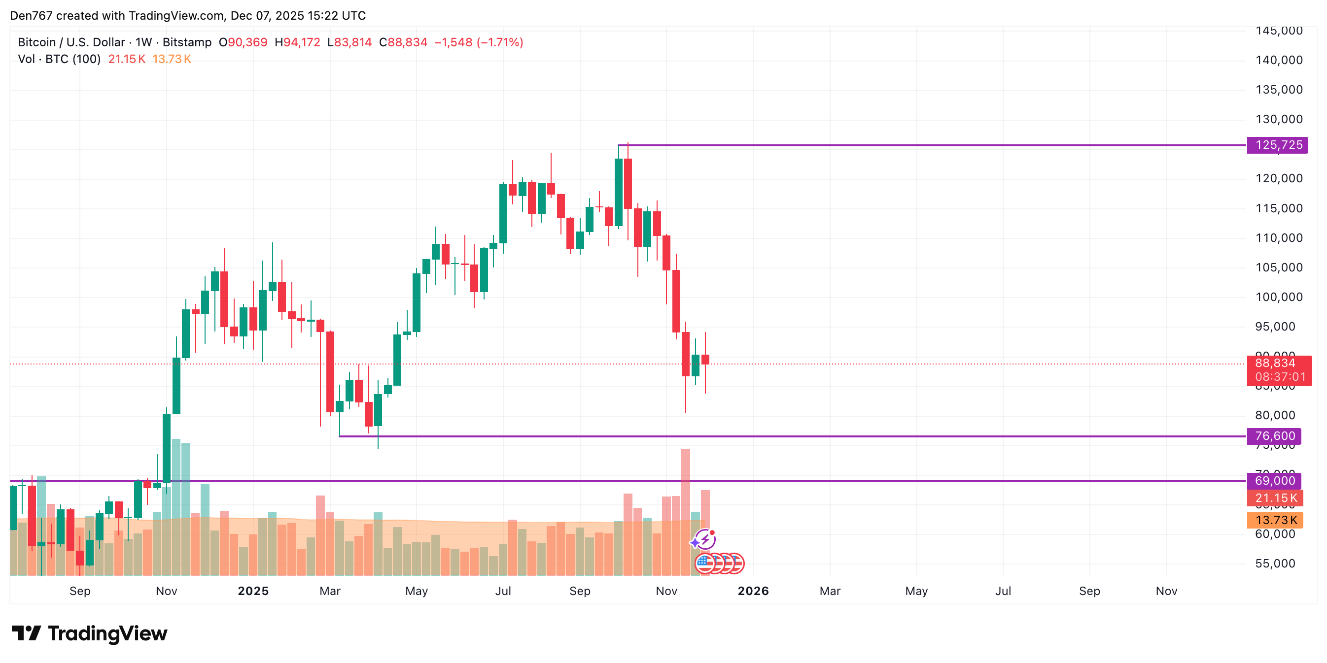 比特币(BTC)报价较昨日下跌近2%,周内累计跌幅达3.58%。
