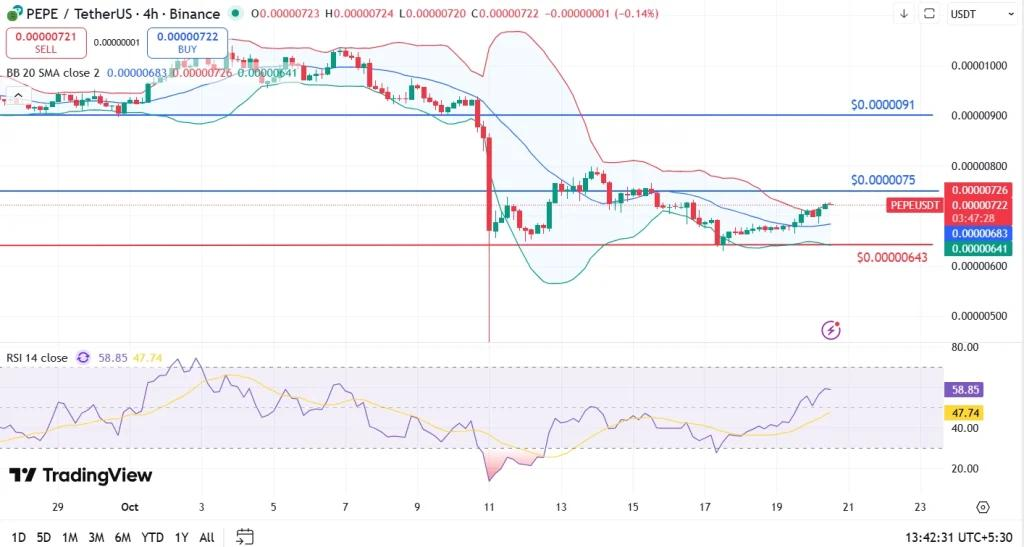 在4小时图上,PEPE在十月初深度回调后形成了短期复苏通道。当前价格正测试0.0000075美元阻力位,而0.00000643美元附近已形成稳固支撑——该位置与布林带下轨重合,并历经多次回测仍保持有效。