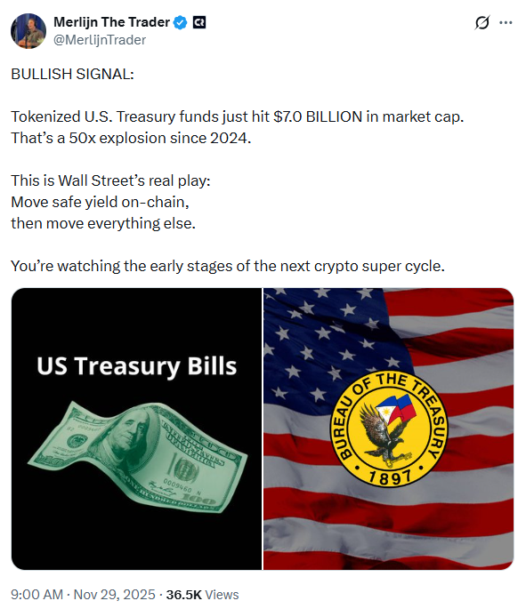 分析师Merlijn The Trader带来另一讨论热点,他分享的代币化美国国债基金最新数据显示:这类基金市值已达70亿美元,自2024年以来增长50倍。