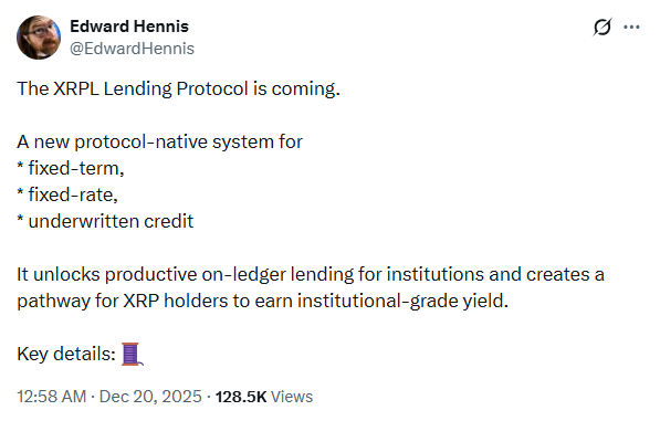 另一则XRP消息涉及Edward Hennis发布的XRP账本借贷开发者更新。Hennis宣布正在开发协议级借贷系统,该体系专为固定期限与固定利率贷款设计。他指出目前大多数加密借贷依赖资金池抵押和浮动利率机制。