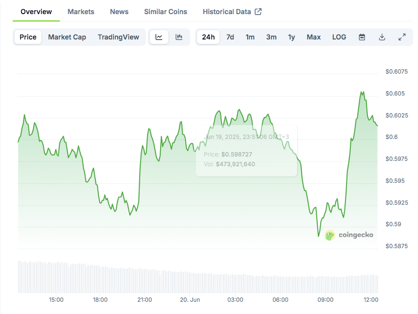 截至发稿时,卡尔达诺交易价格为0.6024美元,24小时微涨0.53%。然而过去一周该代币下跌5.35%。但在更大的楔形形态背景下,这种回调仍在正常范围内。