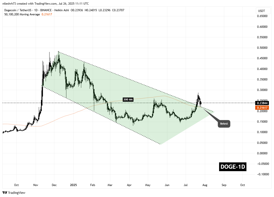 从日线图观察,DOGE已突破扩大楔形形态——该形态通常预示强劲的看涨延续。此次突破近期将价格推至0.2875美元的局部高点,随后出现快速回调。