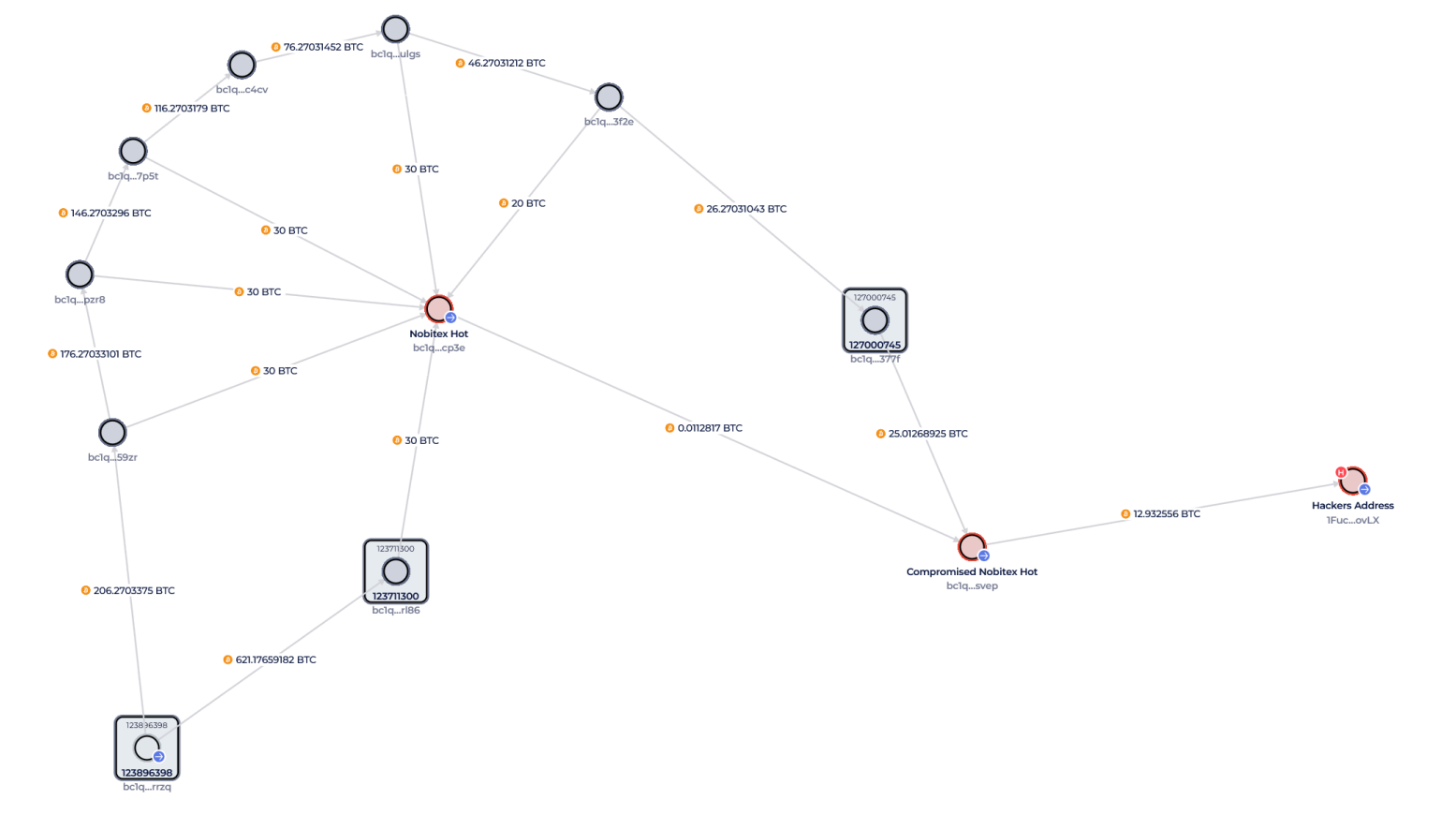 虽然黑客事件令用户震惊,但区块链数据显示Nobitex采用这种资金转移方式已持续多月。与该交易所关联的旧钱包会定期向新钱包发送比特币,随后资金被拆分为20或30枚BTC的小额多次转移。