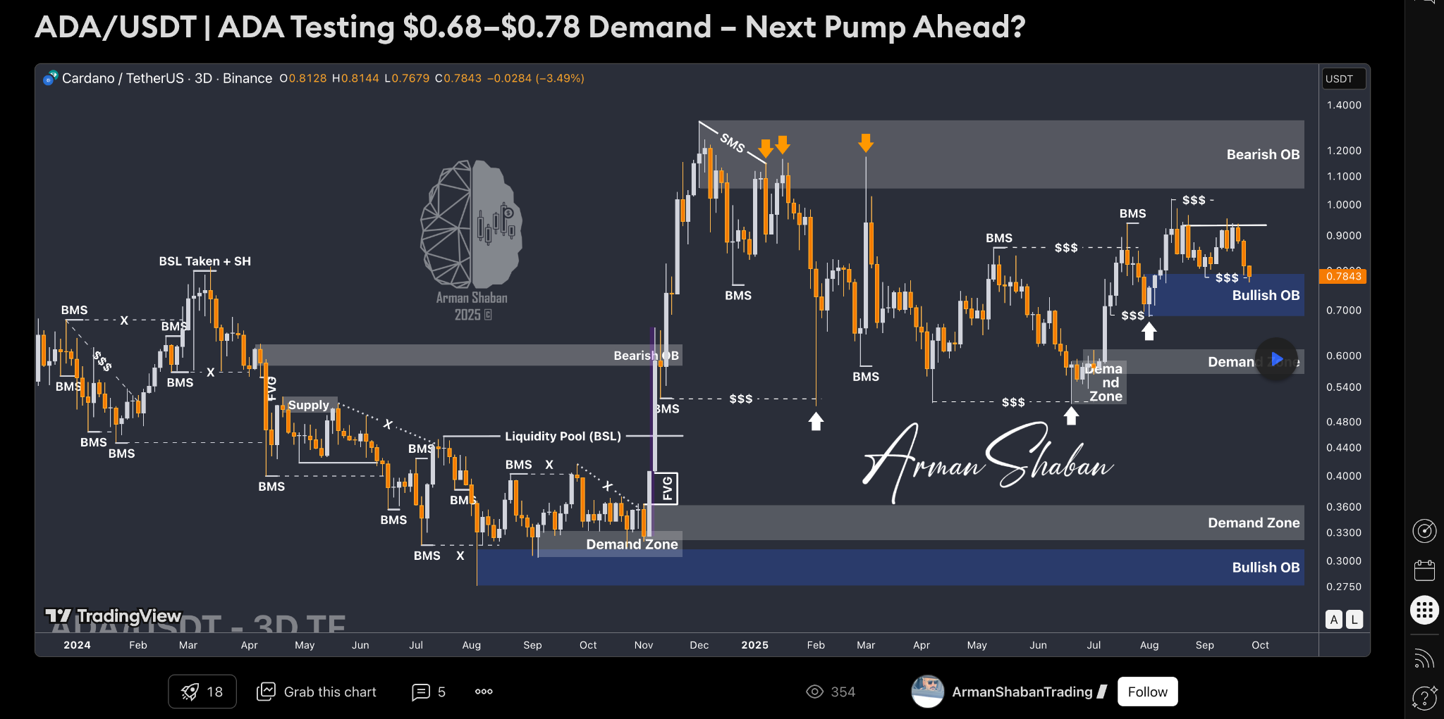 卡尔达诺现报0.783美元,已跌破0.80美元关键位。这一下跌使得分析师对其能否触及1.33美元或进一步下探产生分歧。市场分析师Arman Shaban指出,ADA当前在0.68-0.78美元区间震荡,这个区间对其后续走势至关重要。若突破0.83美元可能开启上行通道,但若跌破0.735美元,空头或将主导市场导致价格继续下探。