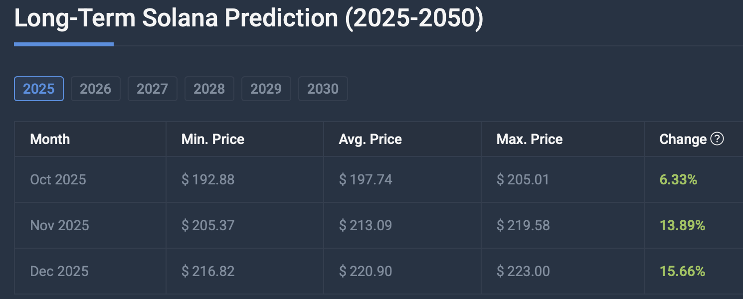 该平台预计第四季度将呈现渐进式增长:10月平均价格197.74美元,11月213.09美元,12月达220.90美元。若预测成真,在机构采用、网络扩容性提升以及质押需求增长推动下,SOL将以接近多年高位的价格收官2025年。分析师普遍认为,尽管短期波动仍存,Solana的长期前景在一线Layer1项目中仍属最强劲之列。