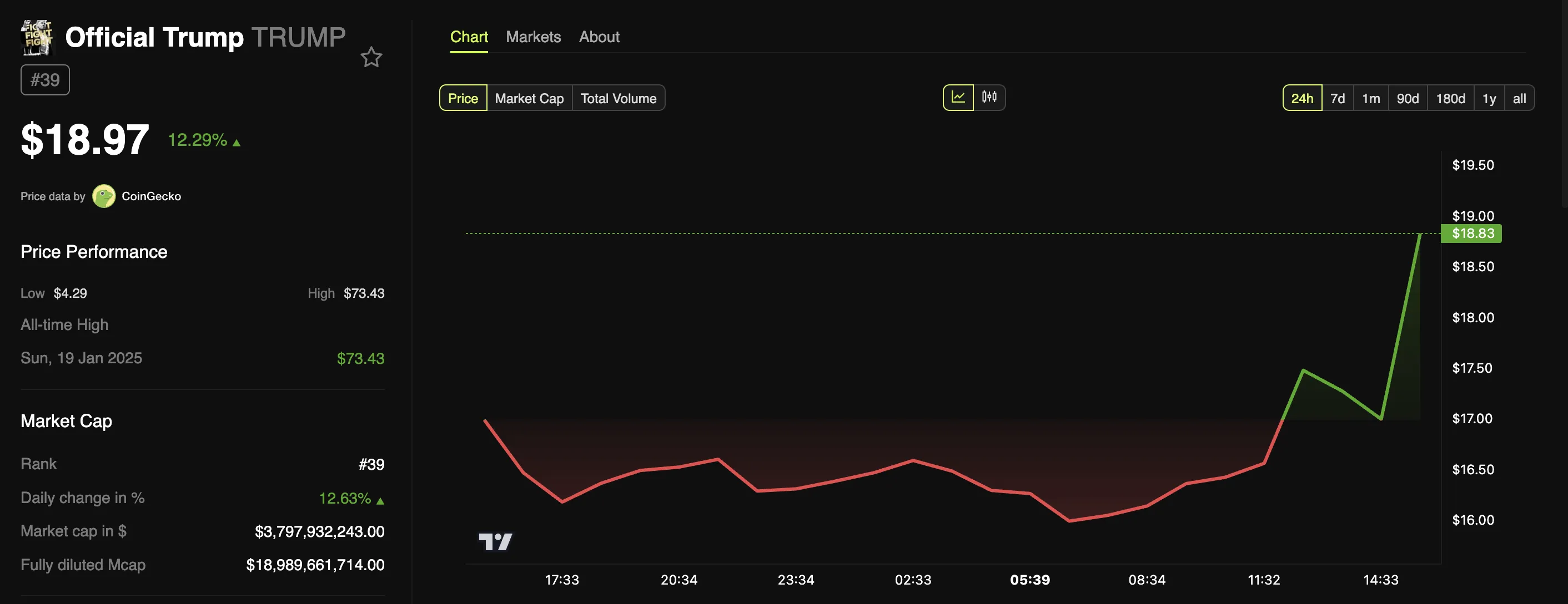 截至发稿时,TRUMP交易价格为18.97美元。然而,这仍比其历史高点73.43美元低了75.90%。与此同时,市场表现良好。