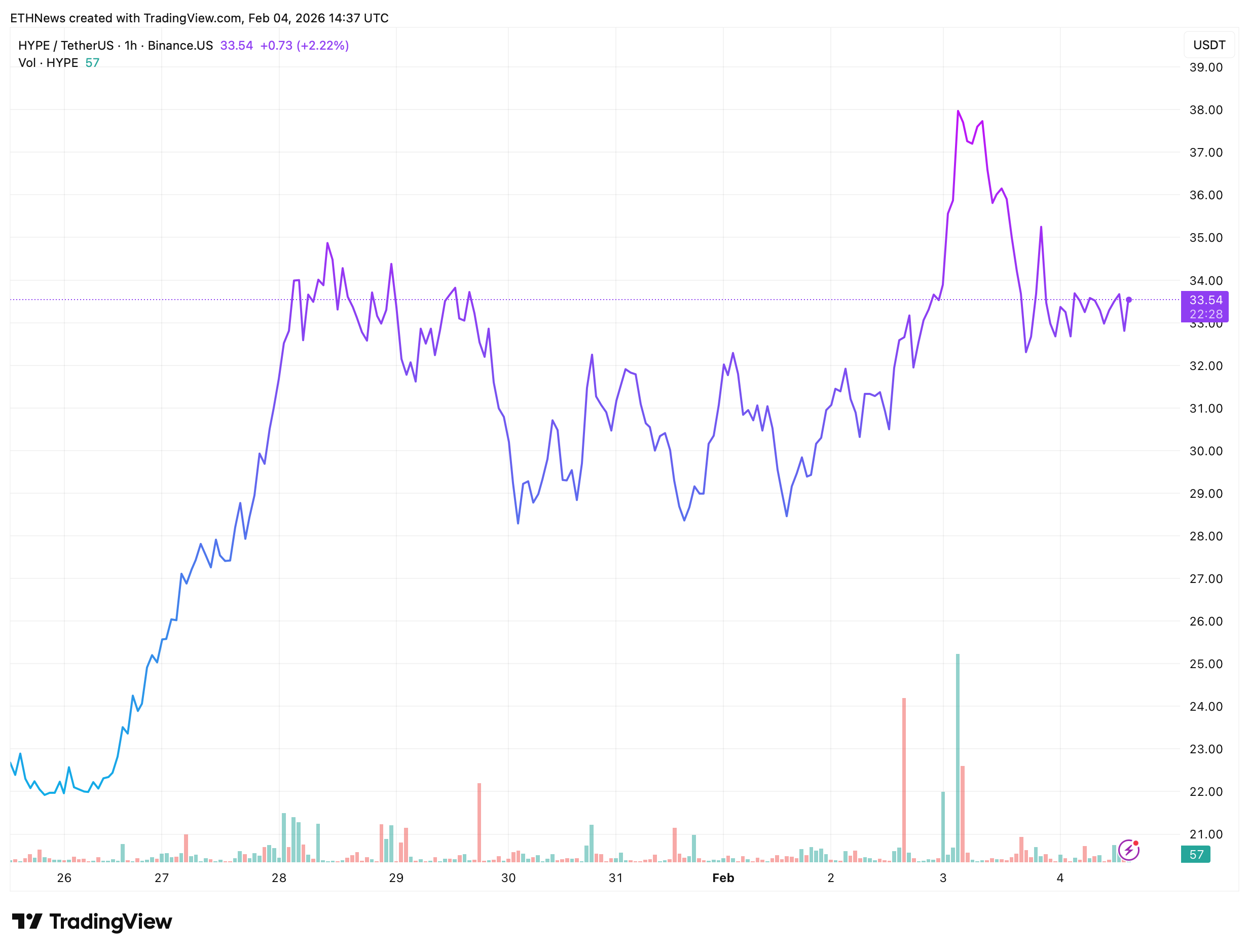 这种市场行为比价格波动本身更具意义。它表明上涨尝试正被消化而非延续。观察时点,HYPE交易于33.5美元附近,虽守住局部支撑,但结构上仍受压制。