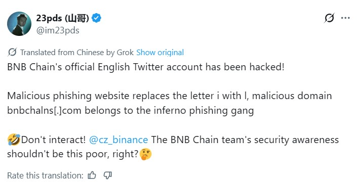 BNB Chain官方X账号遭入侵 黑客散布钓鱼链接窃取加密资产