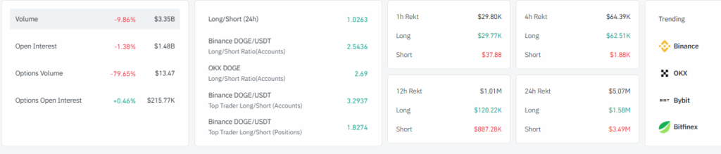 DOGE衍生品活动呈现交易所间的分化格局。衍生品总成交量下降9.86%至33.5亿美元,未平仓合约微降1.38%至14.8亿美元。这些变动表明短期参与度降低,而非整体市场信心的转变。