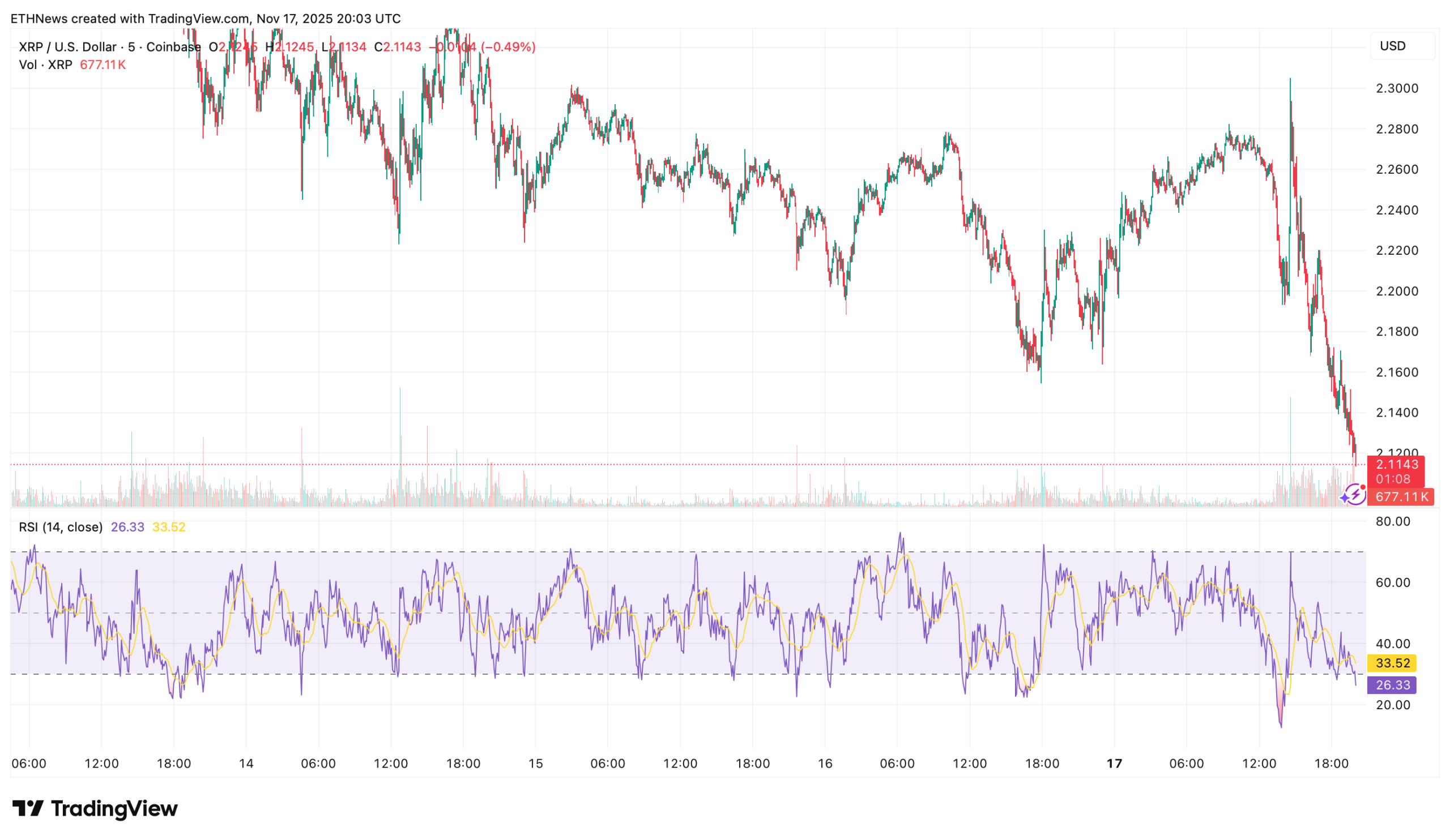 XRP在过去一周延续跌势,累计跌幅近17%。由于多次未能收复2.30美元阻力位,该代币价格已跌至2.11美元。自11月15日以来,这一关键阻力位屡次成为多头攻势的天花板,而最终的突破失败引发了大规模抛售浪潮。