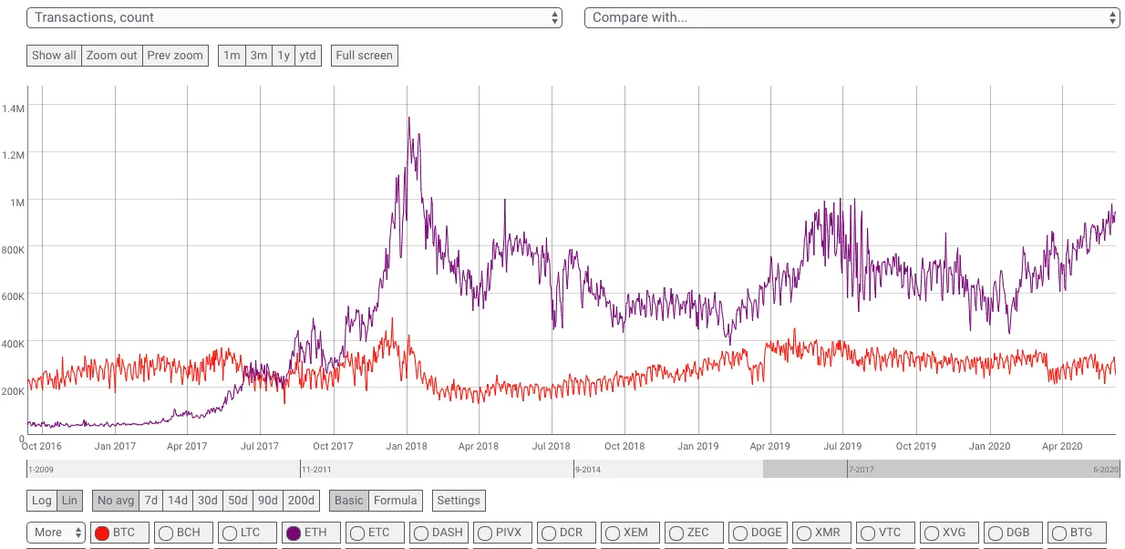 随着活跃地址数量的增加,每日交易量的上升也在情理之中。根据CoinMetrics的数据,以太坊网络每日交易量即将达到100万笔,这是近一年来的最高水平。作为参考,比特币每日处理约30万笔交易。