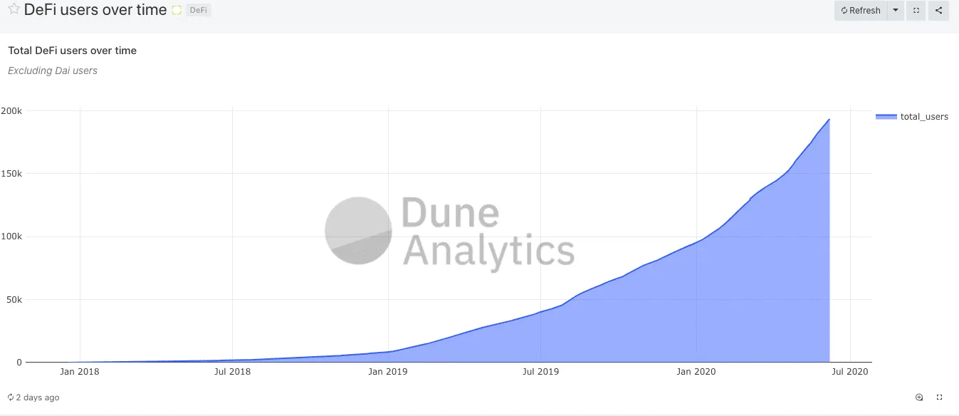 那么DeFi目前占据了多大的份额呢?1confirmation的Richard Chen使用Dune Analytics数据汇总了主要DeFi平台的累计用户,得出的结论是随着时间的推移,DeFi用户总数接近20万。