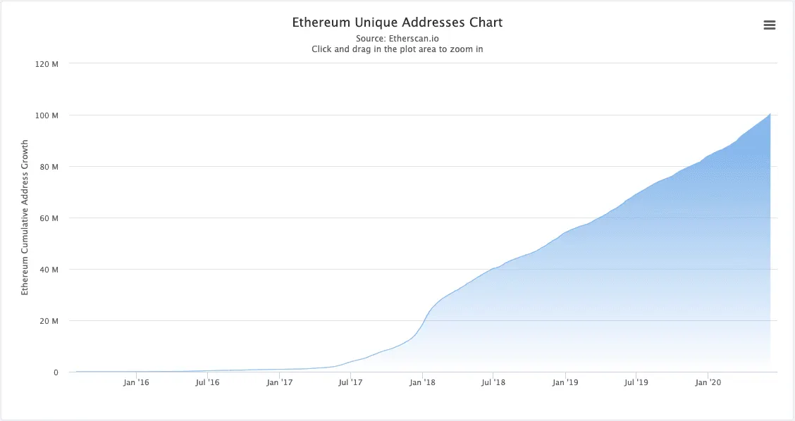 衡量以太坊使用情况有多种方式——总地址数、每日交易量、每日新增地址数等。最近的里程碑是累计独特的以太坊地址总数突破1亿。