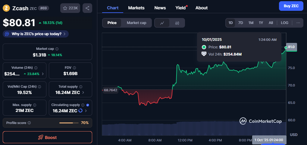 Zcash(ZEC)近期表现亮眼,过去24小时涨幅达18.66%,当前报价80.81美元。其在交易量和市值增长方面均超越门罗币(XMR),数据显示Zcash当前市值达13.1亿美元,24小时交易量突破2.54亿美元。
