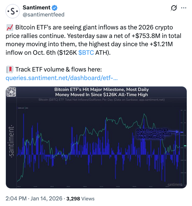 根据加密研究平台SoSoValue数据,现货比特币ETF于周三实现8.436亿美元资金流入,创下2026年以来单日最高纪录,由此实现连续三个交易日的资金净流入。在这三日期间,现货比特币ETF累计吸引超过17亿美元资金,完全抵消了1月6日至9日期间约14亿美元的早期资金流出。