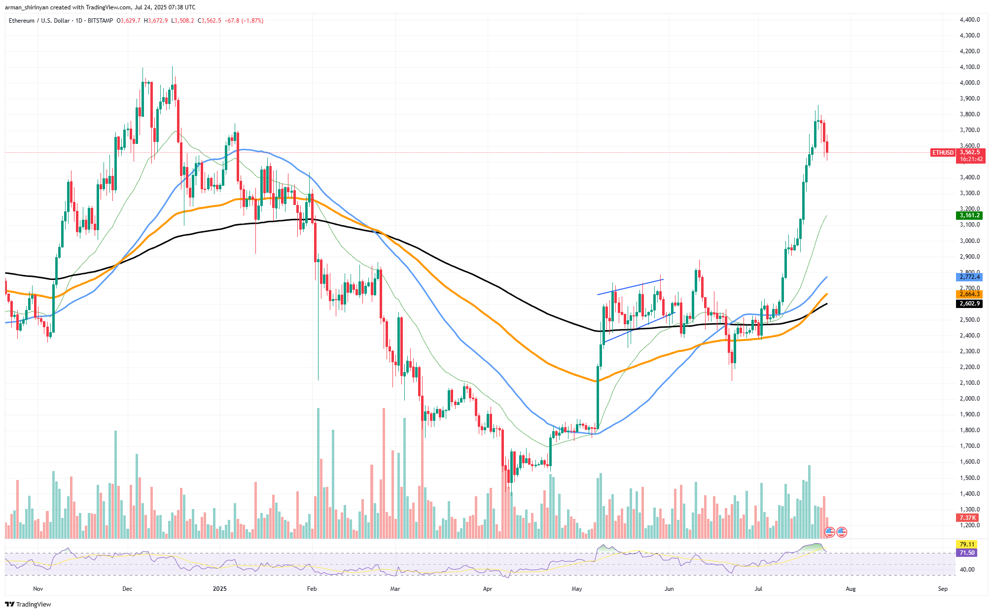 尽管这些操作的最终目的尚未可知,但分散持仓的模式更符合长期资产配置特征,可能涉及场外协议、私人金库或托管解决方案。从技术面观察,以太坊图表同样释放积极信号:ETH在突破3,200美元关键阻力位后曾冲高至3,700美元,虽现小幅回调,但价格走势呈现健康盘整而非崩溃态势。