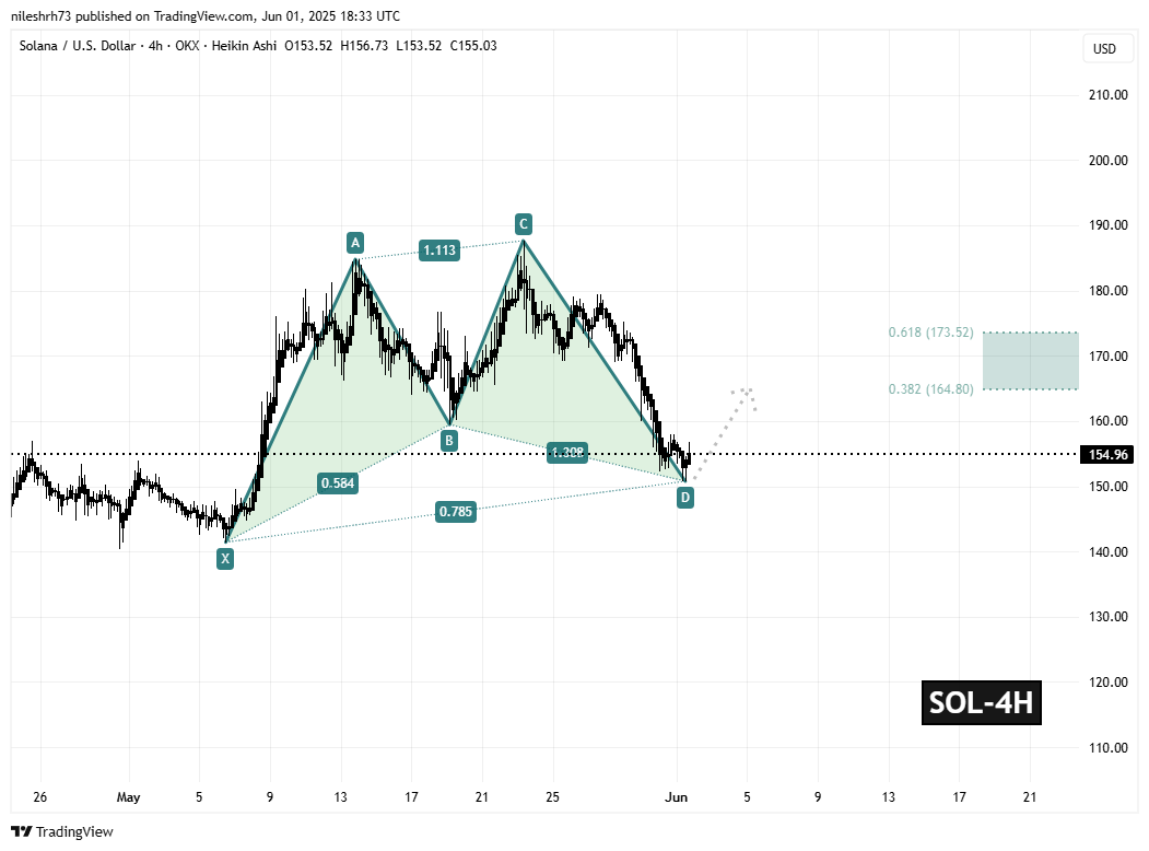 Solana的短期前景取决于市场对154-150美元需求区的反应。若能坚守并向上突破,将验证谐波形态并重振看涨情绪。反之,若失守150美元,则结构失效,可能进一步下探140美元。