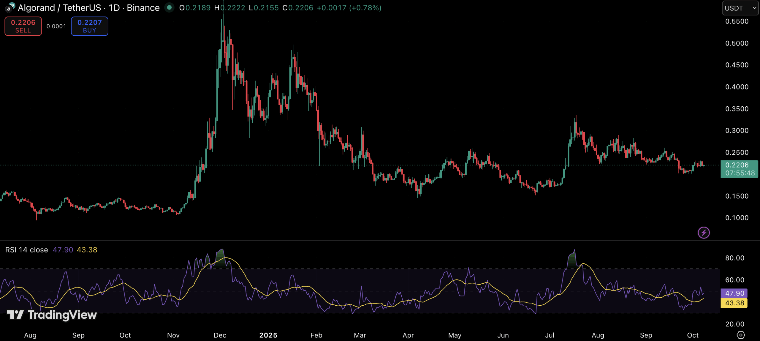 TradingView最新数据显示,ALGO在0.22美元附近保持稳定,相对强弱指数(RSI)徘徊在47的中性区间,表明既未超买也未超卖。历史数据显示,类似的技术形态在盘整阶段结束后往往伴随上涨行情。