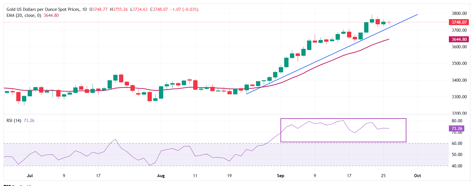 黄金价格目前维持在周四交易区间内运行。短期趋势仍保持看涨,20日指数移动平均线(EMA)在3644.80美元形成动态支撑。8月22日低点3321.50美元延伸的上行趋势线构成关键支撑位。