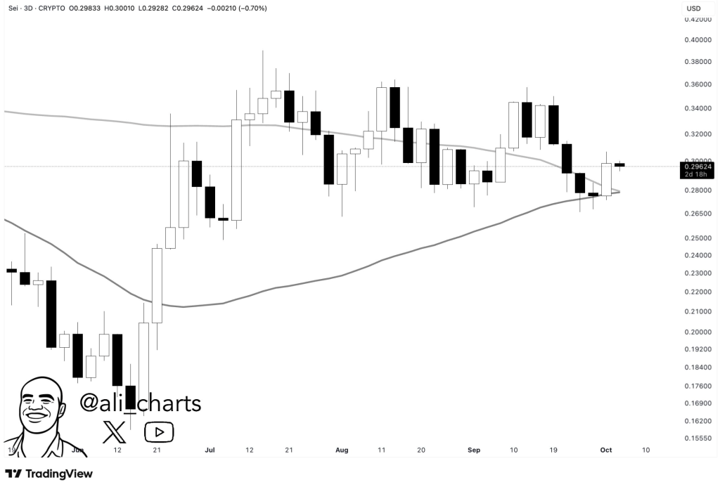 三日图表显示,随着50日均线即将上穿100日均线,SEI价格在0.296美元附近盘整。这一潜在的黄金交叉形态预示着市场可能转向看涨动能,投资者信心正在累积。价格在交叉点下方的持续整理,表明市场正等待新的买盘压力确认。若突破成立,或将开启上升趋势并为SEI生态系统引入新增流动性。