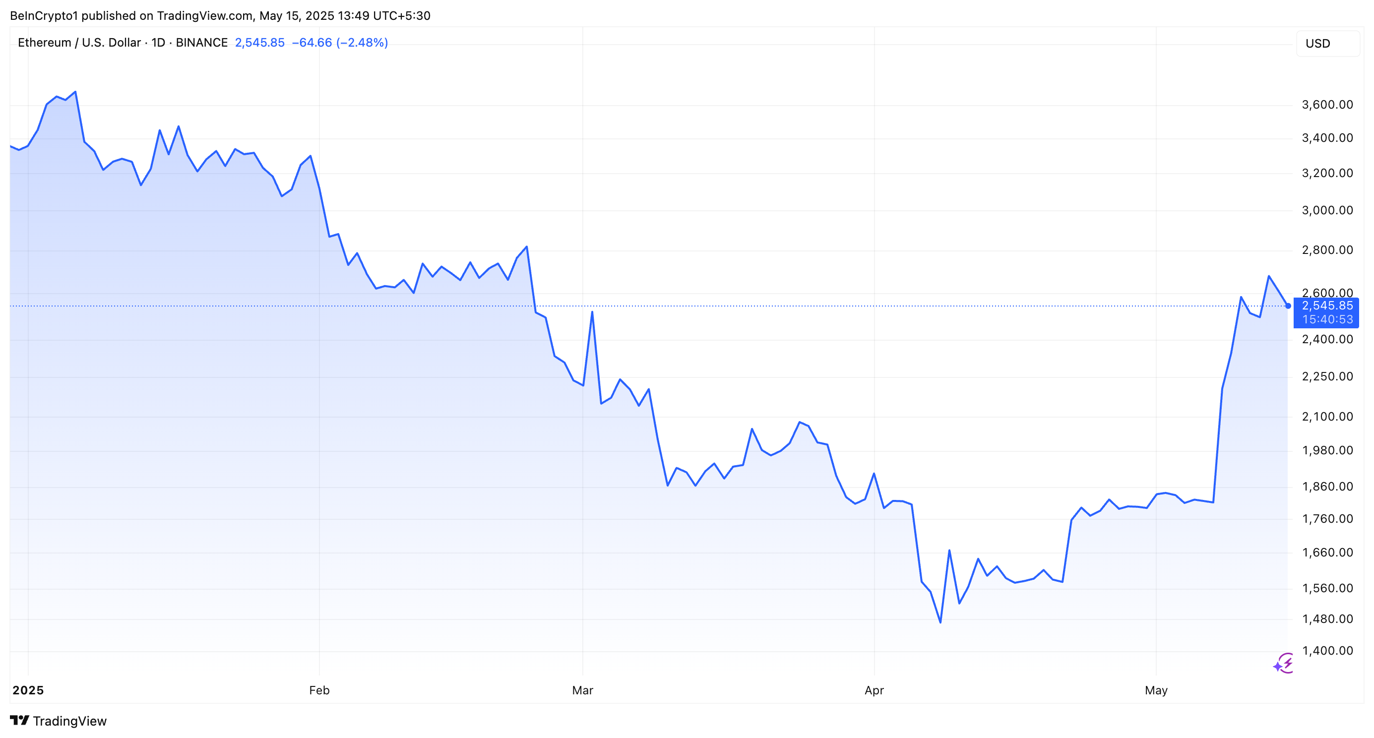 他认为,在以太坊网络实施Dencun升级后,这一收购ETH的决定恰逢其时。Dencun升级推动了以太坊网络的发展,催化了活跃地址数量和销毁率的增加。此外,ETH价格也跃升至两个月来的高点。根据数据显示,过去一天ETH下跌了3.8%。截至发稿时,ETH交易价格为2545美元。