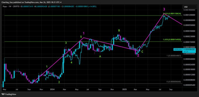 知名加密货币交易员Charting Guy指出,根据斐波那契扩展水平,PEPE可能升至0.00012美元价位。根据他的分析,当前图表处于艾略特波浪理论的第三浪,传统上这预示着进一步的上涨趋势。基于斐波那契2.618水平,PEPE可能经历另一次抛物线式上涨,进一步推动看涨情绪。