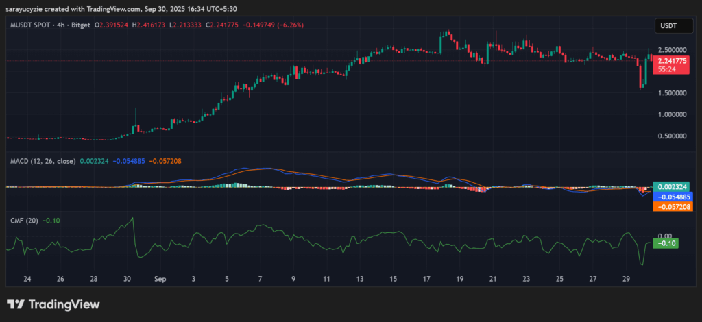 MACD指标线与信号线均位于零轴下方,暗示整体下行趋势未改。只有当MACD突破零轴才能确认趋势转强。当前CMF指标值为-0.10显示资金持续外流,卖压明显。价格存在潜在走弱风险。