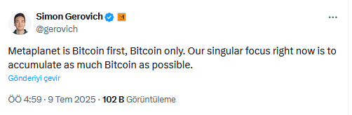 专注于比特币的日本公司Metaplanet首席执行官西蒙·格罗维奇(Simon Gerovich)再度成为头条新闻——他于2025年7月9日在X平台(原推特)发布的声明中强调,该公司唯一使命就是尽可能多地积累比特币,并将未来完全押注在BTC上。