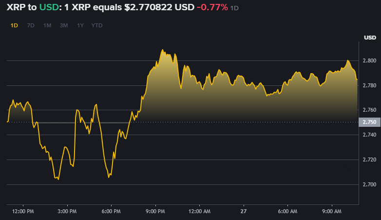 截至最新数据,XRP报2.77美元,日内微跌0.77%,仍处于前述缺口上沿上方。