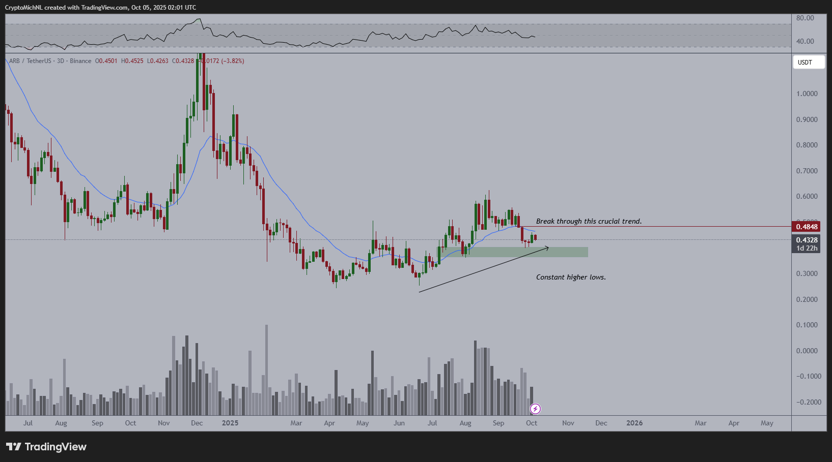 著名加密分析师Michaël van de Poppe指出,Arbitrum已形成更高的低点,这通常是看涨反转的前兆。他将0.48美元视为决定性阻力位——若突破该水平,可能引发强劲上涨行情,目标看向0.70-0.80美元区间。
