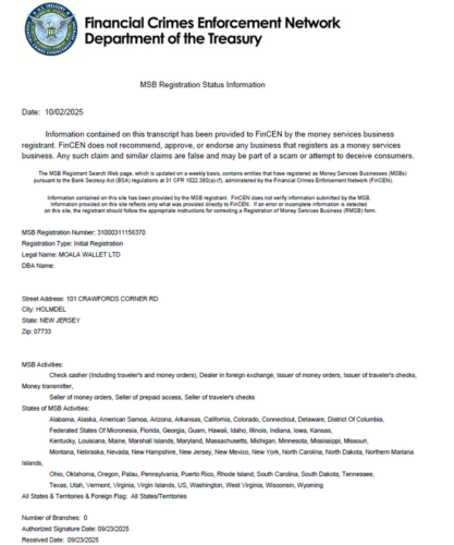MOALA WALLET交易所定位的核心是其多牌照合规框架。平台在美国持有由FinCEN颁发的货币服务企业(MSB)注册资质,并向SEC提交了监管备案,使其能够在全球监管最严格的金融环境之一中运营。