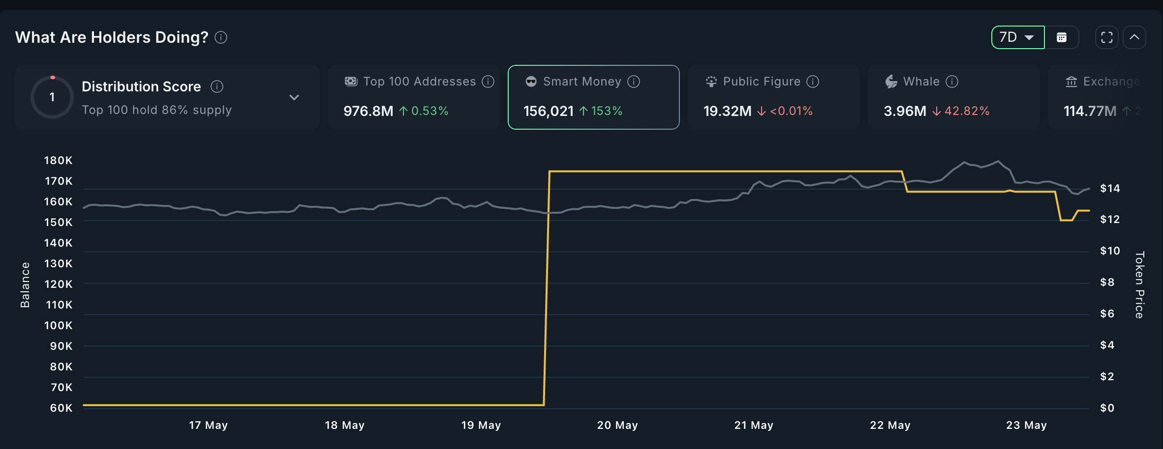 官方特朗普币(TRUMP)是本周第三个出现巨鲸异动的竞争币。在特朗普总统为其前220名持币者举办晚宴前夕,巨鲸持续建立大量头寸。Nansen数据显示,过去七日该代币的"聪明钱"流入量超140万美元,表明高信念投资者兴趣升温。