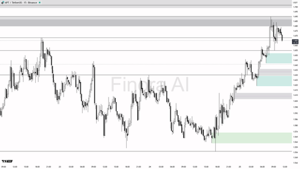 在15分钟图表中,APT价格仍处于高点与低点同步上行的趋势中。然而,价格目前停滞在近期摆动高点下方,这通常是早期投资者开始获利了结的区域,尤其在快速上涨后更为明显。