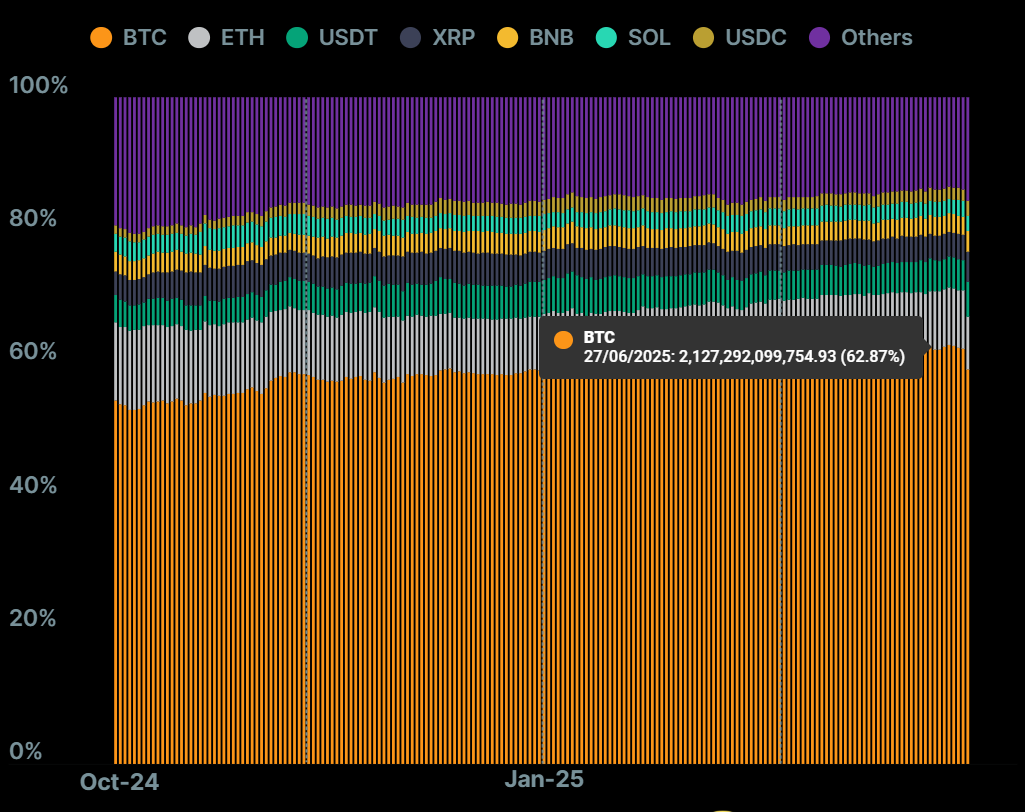 2024年至2025年的数据反映了一个处于转型期的市场。在CoinGecko的《2025年第一季度报告》中,比特币在加密货币总市值中的占比与往年相比有所增加(+4.6%),目前达到59.1%。到了2025年第二季度,比特币的主导地位进一步上升至62.1%。同期,以太坊(ETH)的主导地位在第一季度降至7.9%,为2019年以来的最低点,随后在第二季度小幅回升至8.8%。