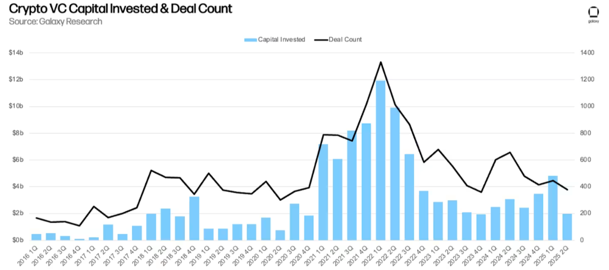 到2025年中,加密货币风险投资与2021-2023年的狂热景象截然不同。将资金分散投入各种迷因币或高风险的快速致富代币发行的日子已经一去不复返。2025年第二季度,对加密货币和区块链初创公司的投资大幅减少,大约完成了378笔交易,融资19.7亿美元,总融资额环比下降59%,交易数量减少15%。
